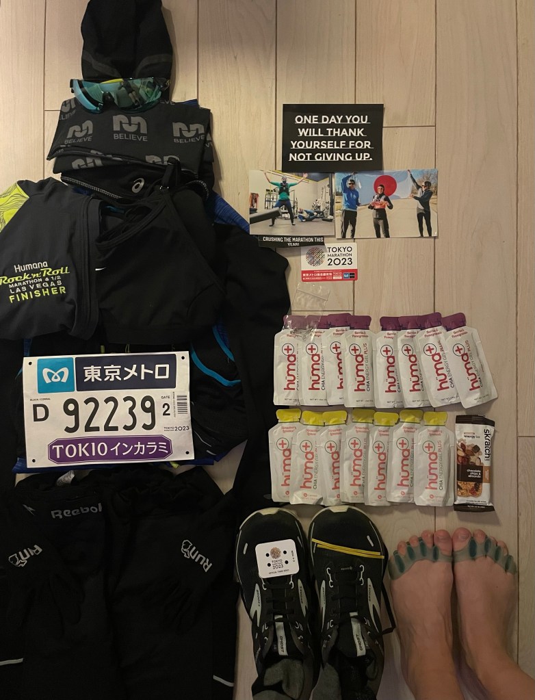 One of my well-respected support crew members shared this with me and really resonated with what race day is all about: “Victory Day” – Victory over patiently waiting since 2020 to run this very marathon, here in Tokyo, Japan. And this is what I will ink to my hand in the morning when I need a mid-race boost.