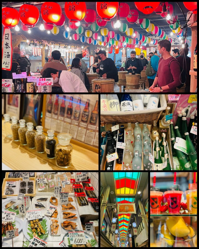 After we walked around for a good hour, we opted to spend the rest of our afternoon in Kyoto at the Nishiki Market. Here, locals and tourists commingle, buying everything from tea cups to squid-on-a-stick. Our mission here was to eat enough food to satisfy a “lunch” equivalent. My husband got shrimp skewers, squid heads, and sushi. I opted for Kobe beef-on-stick and a smoothie (finally). We found a Vegan burger joint for lunch (I’m not Vegan; my husband is) before heading back to the hotel to grab our luggage for our trek back to Tokyo via bullet train.
