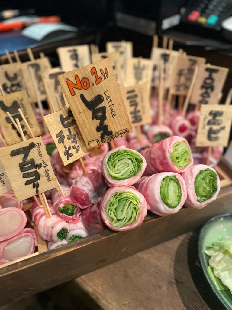 We continued on our day, grabbing food, before a quick reset. We traveled by train to the Roppongi Hills area for one last dinner with Yakinuku (Japanese BBQ steak). We hit up a place on Yelp that did not fall short at all! Everything was on skewers and grilled in front of us – fresh. Pork-rolled everything and every cut of sirloin possible was fresh and ready to devour. It was so good but of course, I was hungry not long after dinner, which has driven my husband crazy! He doesn’t get how or why I eat so much, but I tell him that I’m still making up for lost time earlier in the trip.
